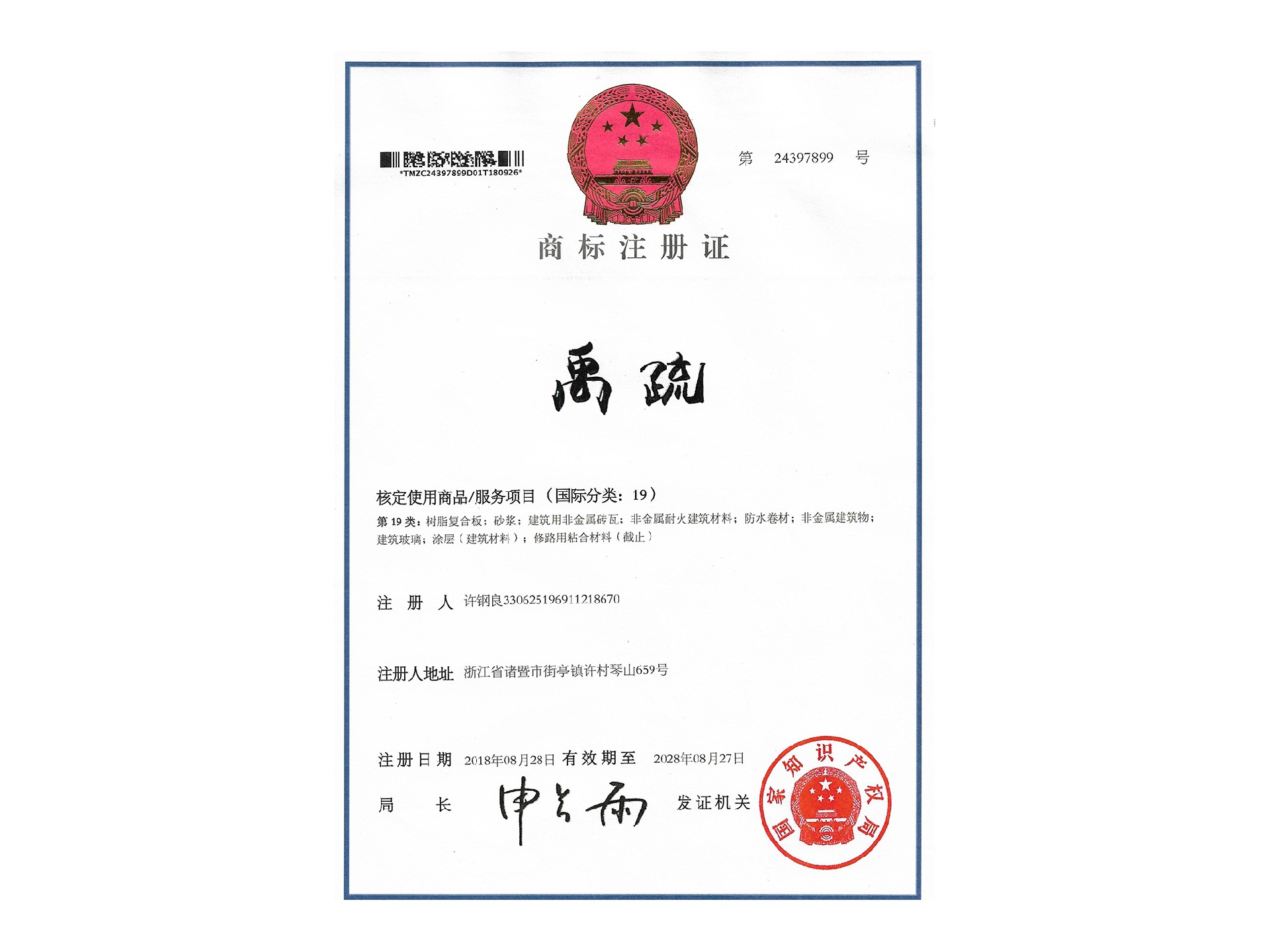 商標(biāo)證書